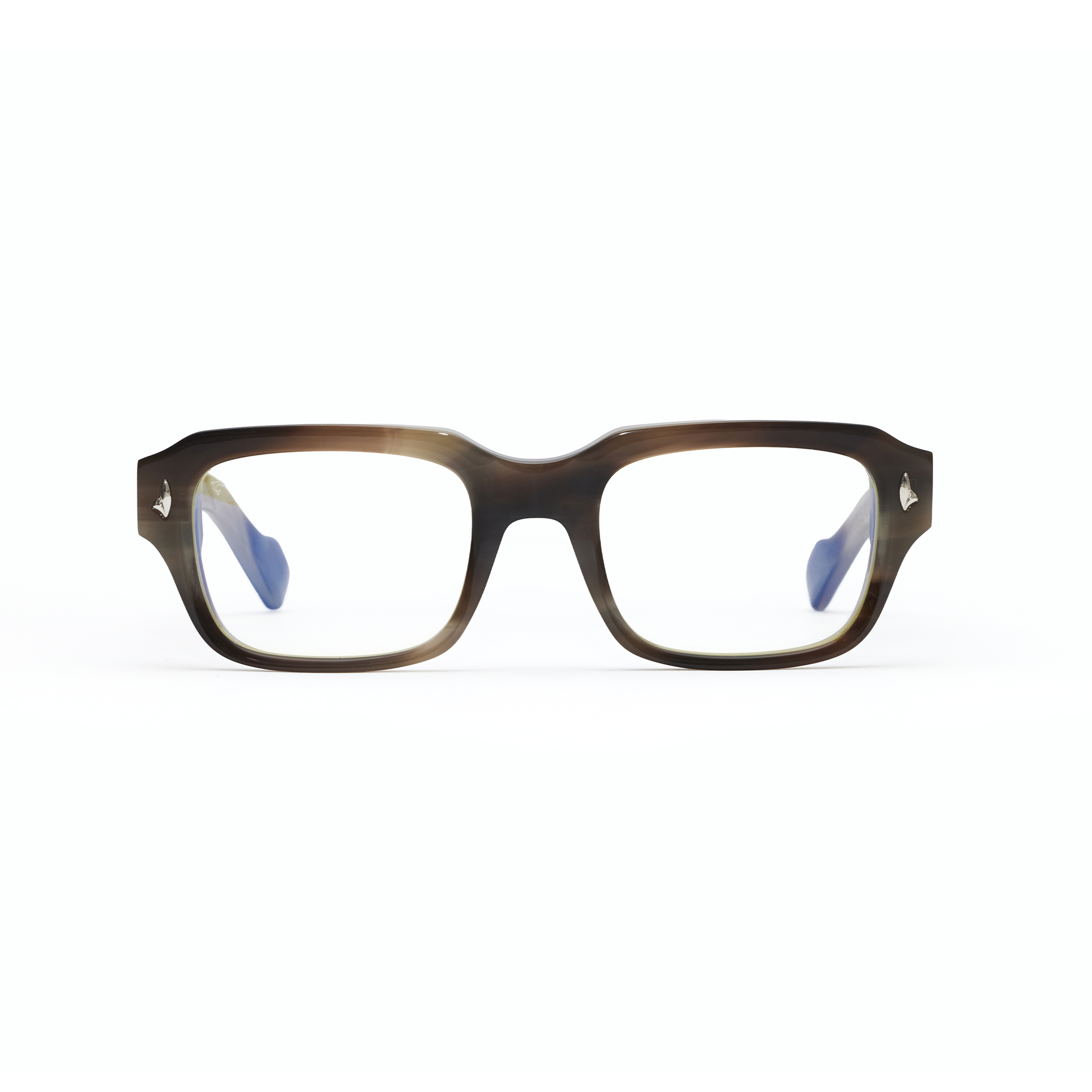 Hand-screwed cabochon rivets securing each hinge